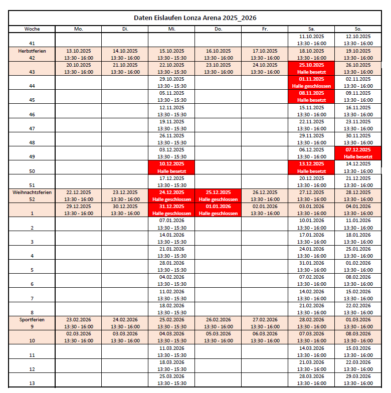 Schlittschuhe und Helme können vor Ort gemietet werden.